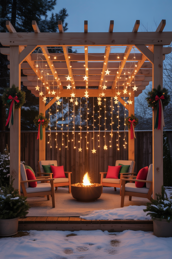 A starlit pergola transforms any outdoor space into a magical winter wonderland, making it an essential addition to your Christmas decor. By draping twinkling fairy lights across the beams and adding hanging ornaments or garlands, the pergola becomes a cozy, illuminated retreat perfect for holiday gatherings. This enchanting setup not only enhances the festive atmosphere but also provides a unique focal point for your outdoor Christmas decorations, delighting guests and passersby alike.